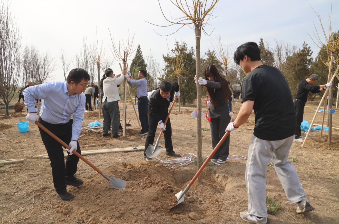 活動現場春意盎然、干勁十足。干部職工們分工協作、默契配合,嚴格按照規范流程,有序完成扶苗、栽種、填土、圍堰、澆水等各道工序,每一個環節都細致認真、一絲不茍。經過共同辛勤勞作,近百株紫葉李、木槿、國槐、丁香等苗木迎風挺立,錯落有致,為春日永定河畔再添盎然生機與生態新景。